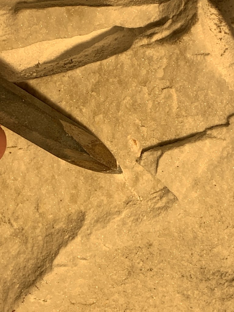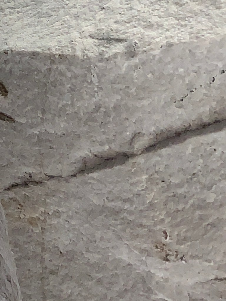 The point is, to the eye, if not to the camera, the two discontinuities look almost identical but the first is a crack going straight into the stone and the other is just a surface flake.
