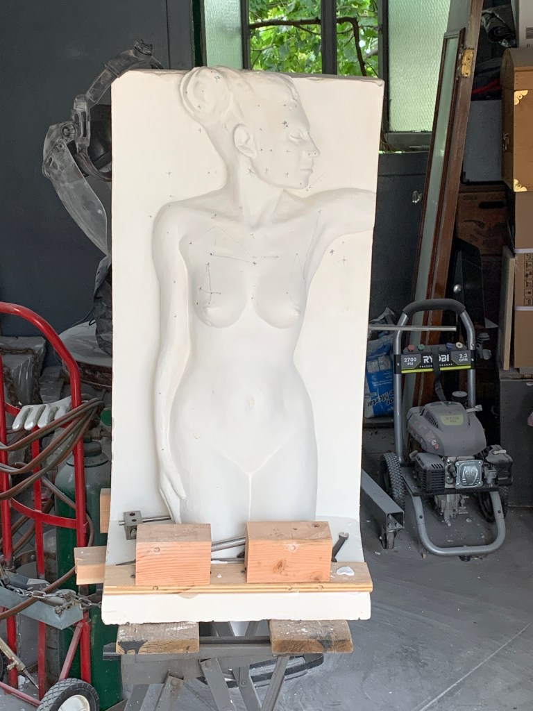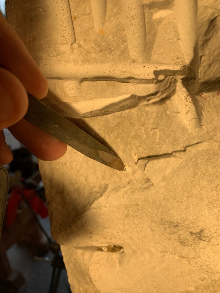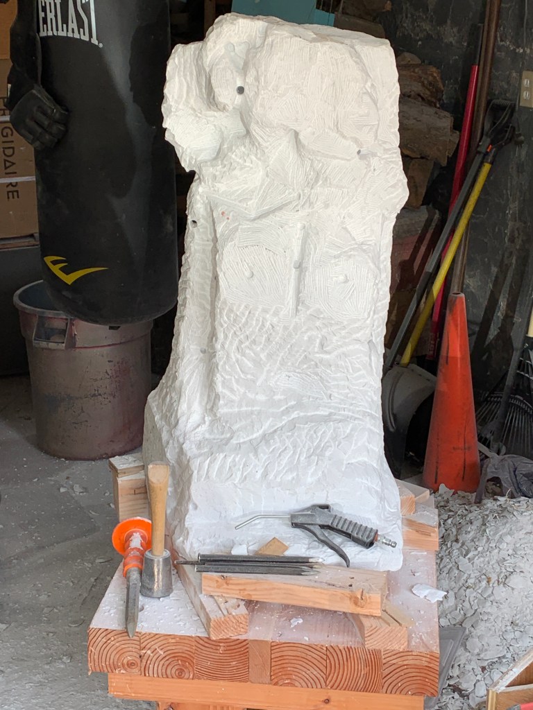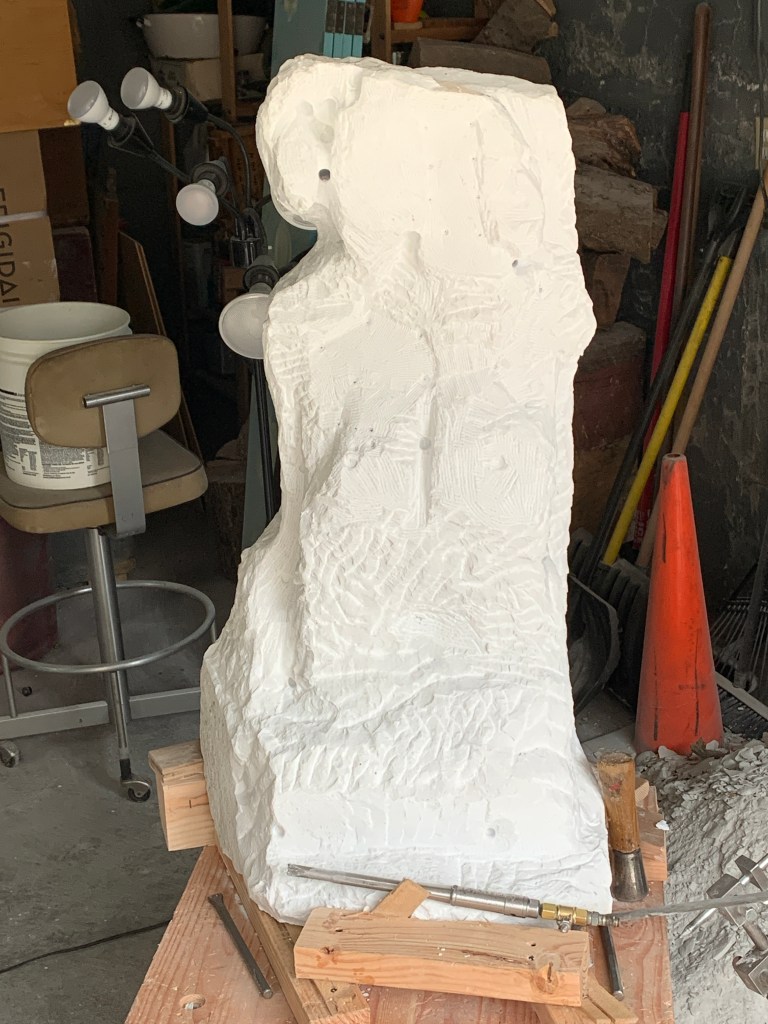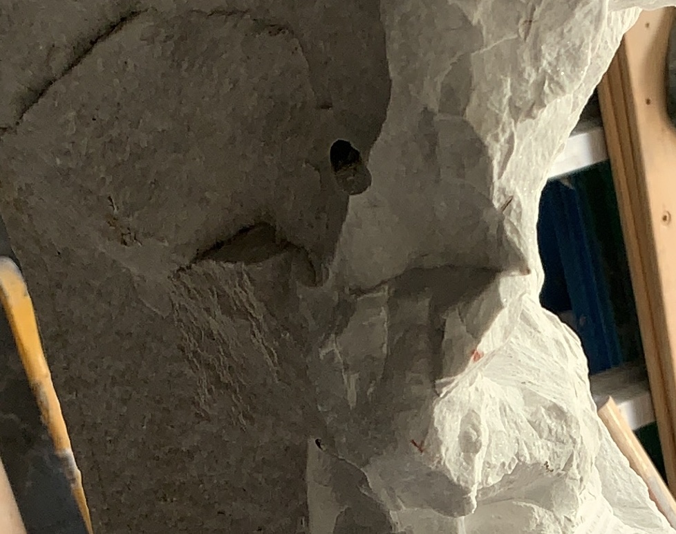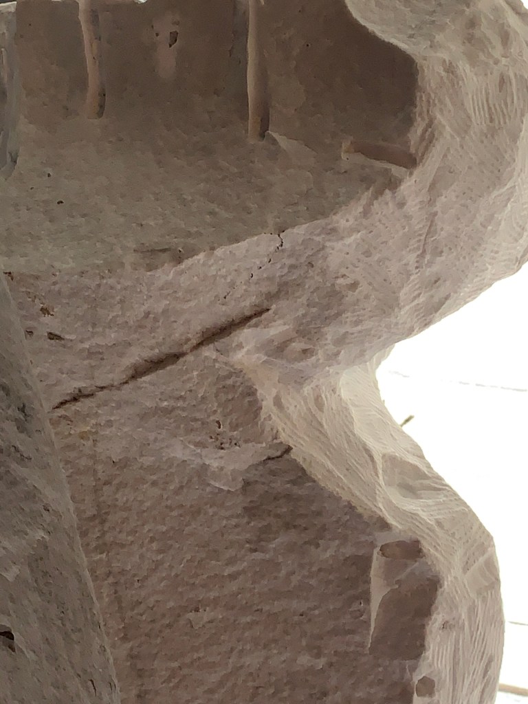 The piece has evolved, or more precisely, adapted, to my discoveries about the stone. Even before starting to do any real carving, I’d whittled away one-third or more of the stone that seemed suspect. The piece was supposed to be a deep relief on the surface of just one side of the block but there was so little stone left behind the figure, particularly on her right, that I’d decided to remove the background entirely on that side. It didn’t look right with just a thin slab behind her.