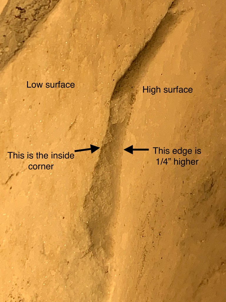 The picture on the left, below, is very similar. Again, you’re looking at a vertical, mostly flat face with a small step so that the area on the right side of the left picture is about 1/4″ higher than the area on the left side. There’s a sharp ledge dividing the two areas exactly like in the picture above, but perhaps a quarter inch high.